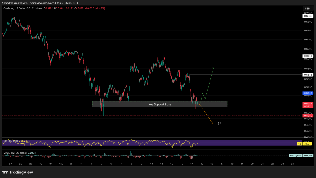 ADA is currently on the upside at $0.5157, hovering around the crucial support zone between $0.49 and $0.52 that has held it for weeks. If you zoom out, the bigger picture is not pretty. Cardano has been sliding downhill for months, dropping from around $0.70 to where we are now.