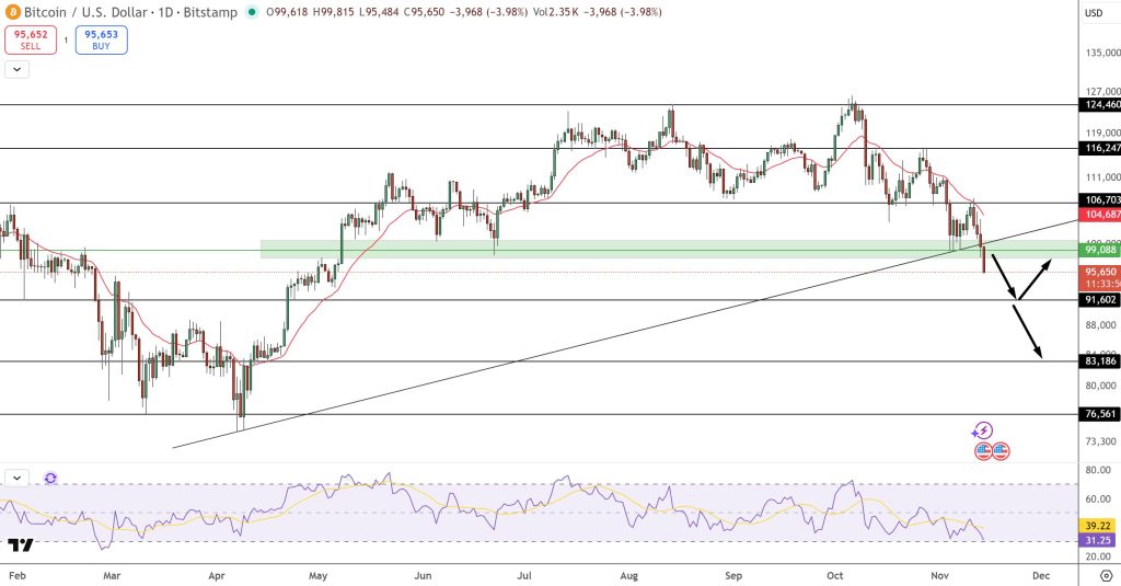 Bitcoin’s daily chart shows a clean break below the long-term uptrend line, transferring the structure into a developing downtrend. A rejection candle at $99,000 underlined the seller’s control, while the price is now above a critical liquidity band between $94,500 and $92,000.