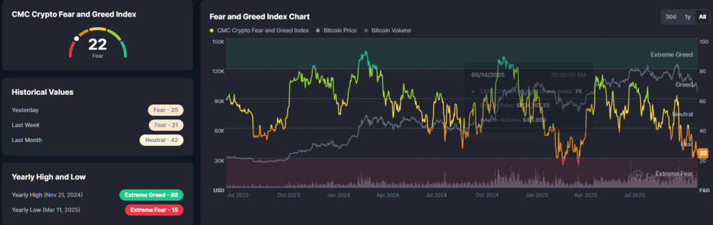 Crypto markets responded quickly to the deteriorating macro picture. The widely tracked Fear & Greed Index fell to 22, its lowest reading since April, signaling growing anxiety in digital assets.