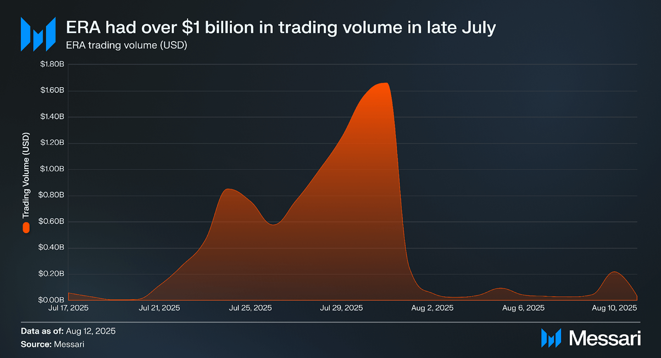 ERA’s trading volume has been quite variable since launch, reflecting both initial liquidity events and subsequent market normalization. ERA had $59.1 million in volume at its debut on July 17, 2025, followed by a decline to $7.2 million by July 19 as early speculative flows subsided.