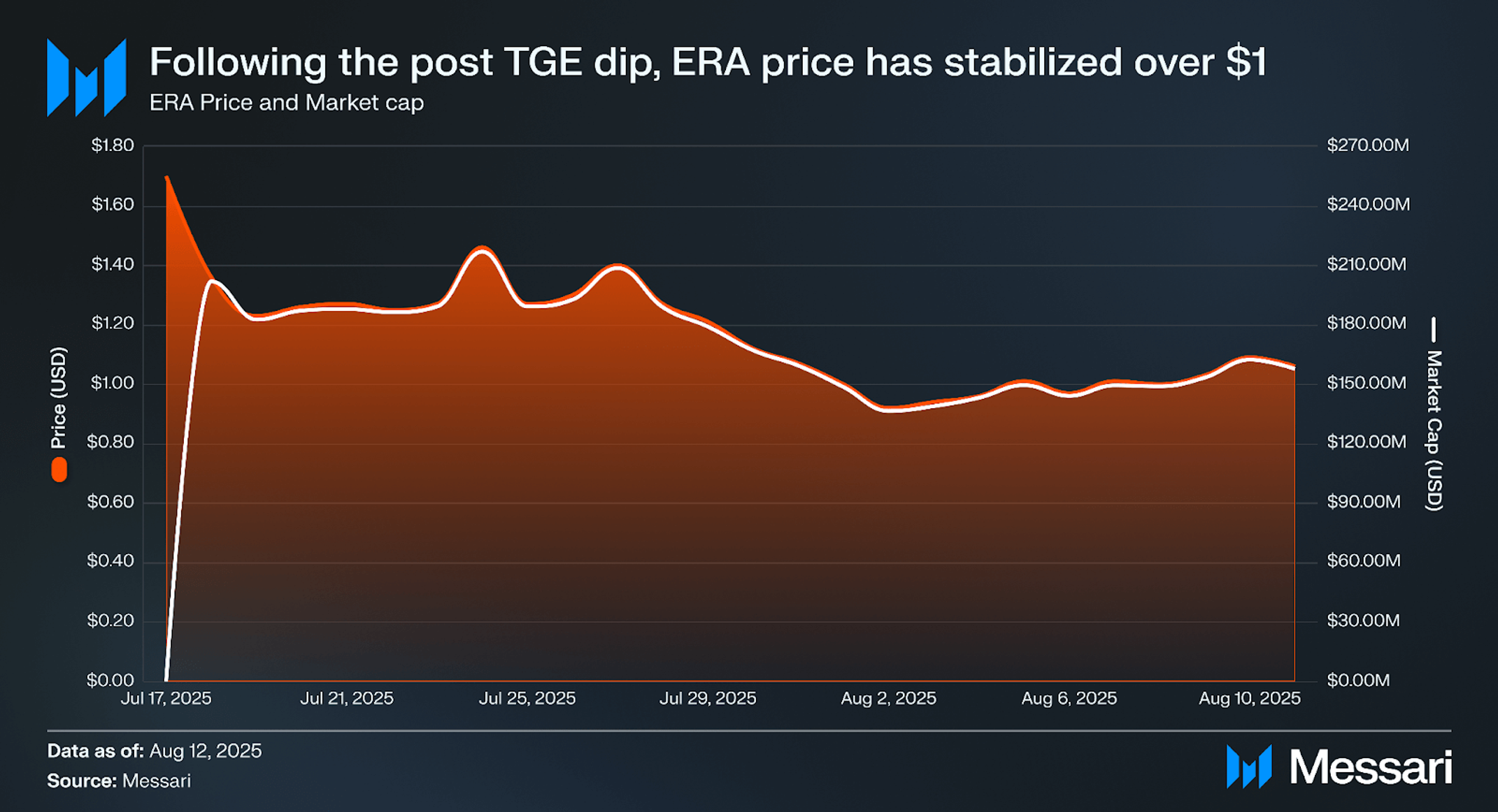 Following this peak, ERA entered a gradual downtrend, bottoming at $0.92 on August 2 with a market cap of $136.4 million. This was followed by a modest recovery, with prices rebounding to $1.09 and the market cap reaching $162.3 million on August 10, showing stability and a strong foundation over $1.00.