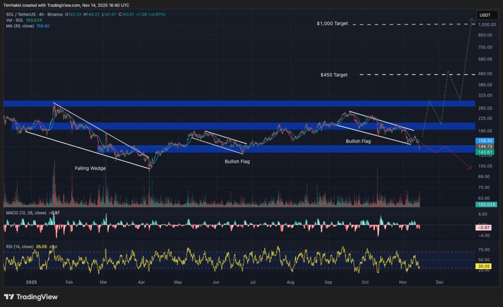 After touching $250 in January and falling to almost $100 in April, SOL is now trading around $144, still 51% below its previous high of $293. Technical indicators show that the token is breaking out of a bullish flag pattern now, supporting ChatGPT’s optimistic year-end target of $1,000