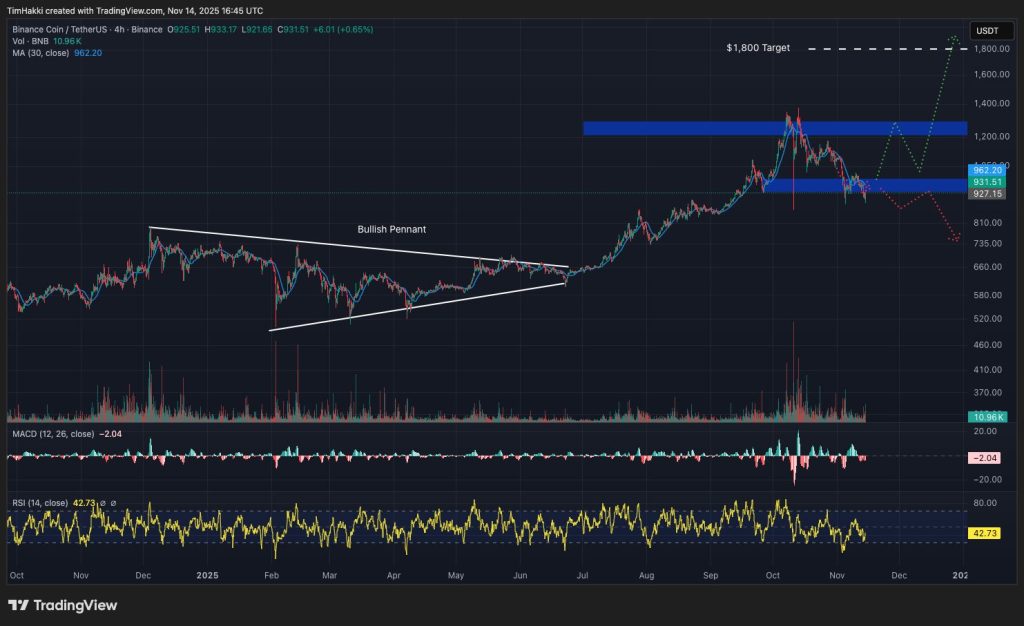 Last month, BNB broke out of a bullish pennant, jumping to an all-time high of $1,369.99 before taking a 32% dip to its current price of $931.