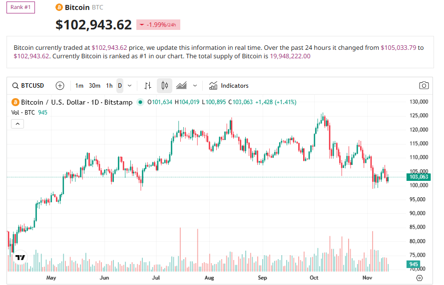 Despite the historic news, crypto markets have so far reacted cautiously. Bitcoin is trading at $103,039, down 1.4% in the last 24 hours and 7.5% in the past week, with daily trading ranging between $100,836 and $105,297.