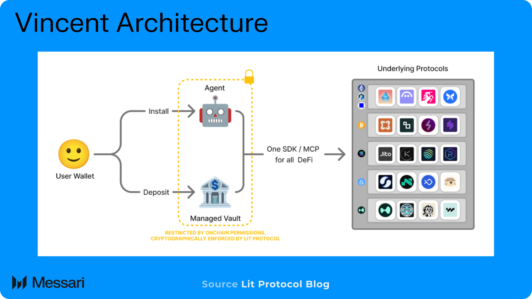 In May 2025, Lit Protocol launched Vincent, a secure wallet delegation framework that lets users authorize AI agents to manage onchain activity within strict user-defined limits. Built on Lit’s threshold cryptography network, Vincent enables developers to ship AI agents and onchain automations with decentralized key management and user-owned permission systems. On September 3, Vincent entered early access, opening the platform to all users and developers for the first time.