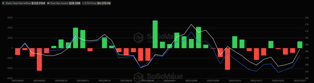 In addition, the US ETH ETF broke the streak of flow on October 27, with $133.91 million in influxes. The total net outflow is now at $14.49 billion.