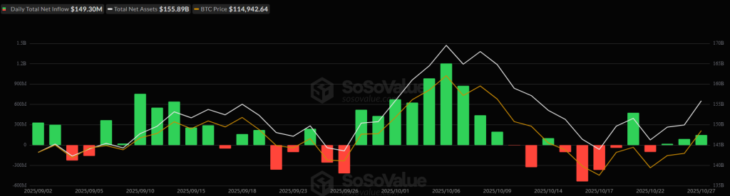 The US BTC spot exchange-traded funds (ETFs) registered $149.3 million in streams on Monday, for a third consecutive day. The total net outflow is now at $62.13 billion.