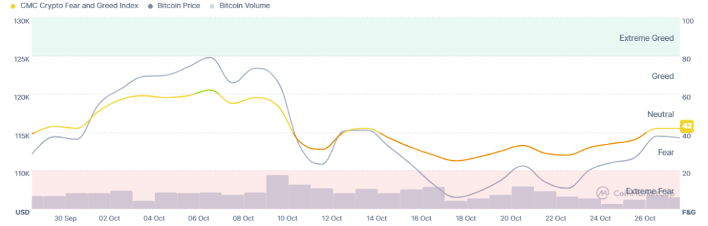 Meanwhile, the sentiment of the crypto market has not changed in the past day, it remains in the neutral zone. The index of fear and greed of crypto remains at 42 today.